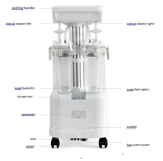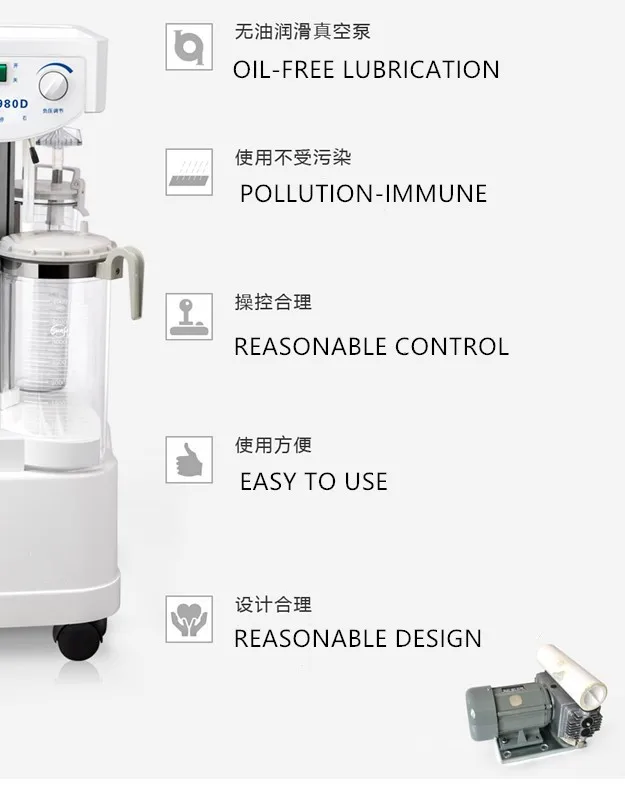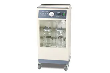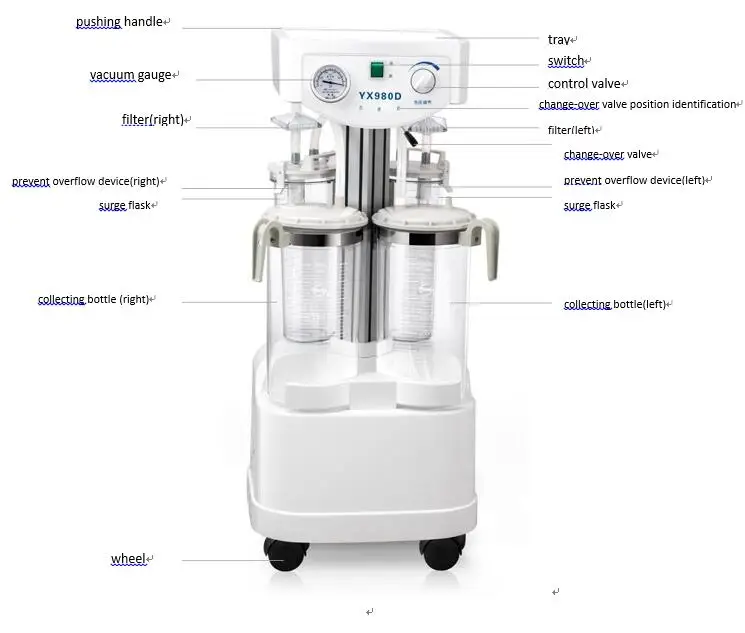 Model YX980D Electric Suction Apparatus offers high vacuum and high flow with double piston cylinders. It rapidly builds up a powerful vacuum, and is especially used for surgical operations where large quantities of fluid must be suctioned out quickly. Advanced design idea as well as a perfect configuration performs satisfactory functions