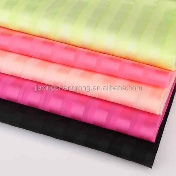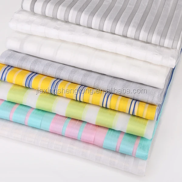 Our polyester striped organza is lightweight, feels great, breathes well, and is colorful. Widely used in fabric, bridal, clothing, home textile decorations, flower packaging, etc.