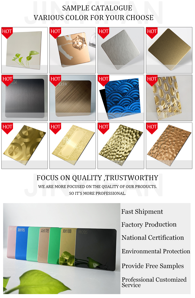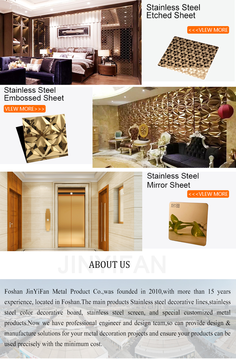 1. Professional team More than 10 years of experience in stainless steel sheets, decorative strips and screens. Providing design and manufacturing solutions for metal building decoration projects. 2. Multiple choices We supply a variety of stainless steel products, with over 5,000 products for you to choose from. 3. How can I get some samples? There are samples in the store and free samples are available. The catalog is ns and we have samples in stock, Customized samples take about 3-5 days. 4. Excellent service High quality, fast delivery, reasonable price, manufacturing factory, Direct sales, 24-hour online service. 5. OEM and ODM services OEM is accepted to meet your customization needs. 6. Flexible MOQ Any quantity can be supplied if we have your specifications in stock. sZB02 free sample 201 304 stainless steel decorative metal plate with pattern openings |