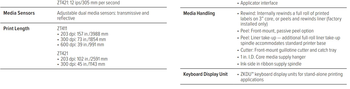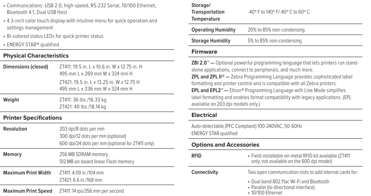 | Max. Resolution: | 600 dpi/24 dots per mm (optional for ZT411 only); | Model Number: | ZT411 RFID; |
