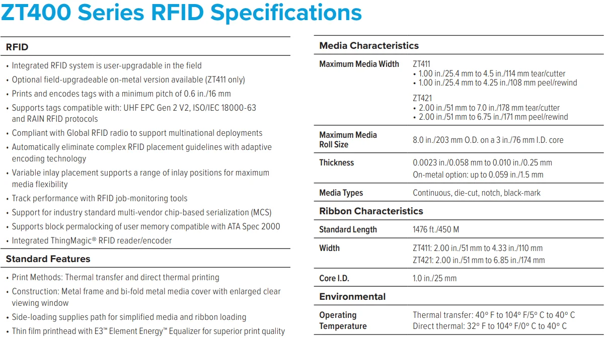 The ZT400 Series RFID offers high throughput and features an all-metal frame for rugged reliability in harsh environments. The 4-inch ZT411™ RFID and 6-inch ZT421™ RFID can print and encode tags with a minimum pitch of 0.6 in./16 mm. And, the ZT411 can print up to 600 dpi for extremely crisp resolution.