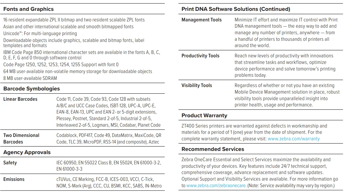 | COMMUNICATION METHODS | Standard: USB 2.0, high-speed, RS-232 Serial, 10/100 Ethernet, Bluetooth 4.1, dual USB Host Optional: Parallel (Bi-directional interface) Wireless dual radio with 802.11ac/Bluetooth, 10/100 Ethernet, Applicator Interface |