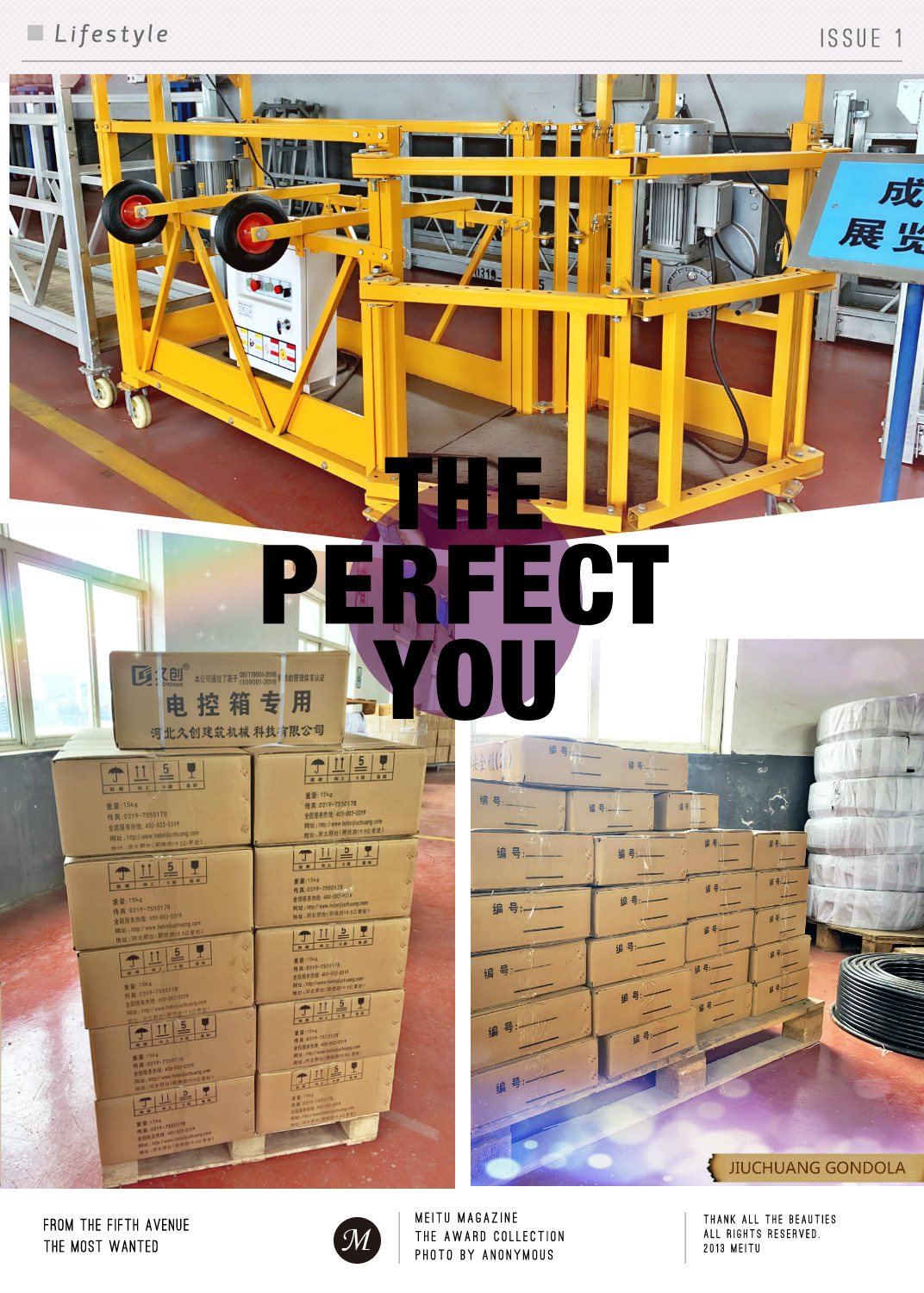 The electric scaffolding platform is composed of a suspension mechanism, hoist, safety lock, electric control box and platform. It has a reasonable structure and is easy to operate. It can be disassembled and assembled arbitrarily according to actual needs. The electric scaffolding platform is suitable for the construction, decoration, cleaning and maintenance of high-rise buildings with external walls.