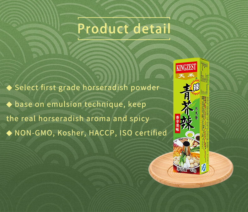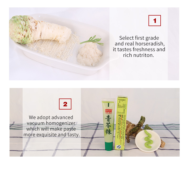 Mustard is a natural green plant rich in many nutrients. It is popular in different types of dishes as it can increase appetite. Appropriate consumption can also play a role in sterilization and detoxification, especially widely used in sushi, sashimi and other seafood.