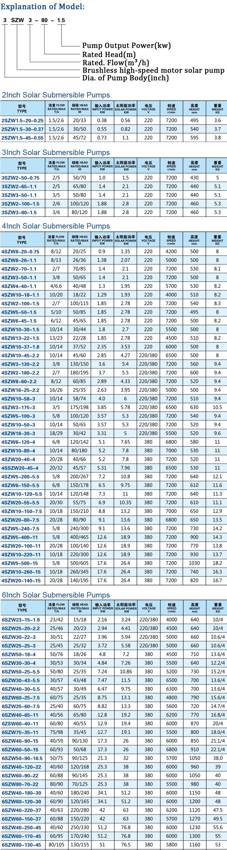 SZW series solar water pump price DC water pump solar power can be AC or DC power supply. If the controller is connected with the solar panel, then the water pump is a 48v DC submersible solar water pump Note: solar water pump price DC water pump solarThe power in the chart is actually the output power. However, when referring to the power of a solar water pump, we usually refer to its input power. If we want the solar high pressure pump to work in solar mode, we have to calculate its input power (its electrical power). If the pump is powered by AC, the head, flow and power in the chart are all relevant values.