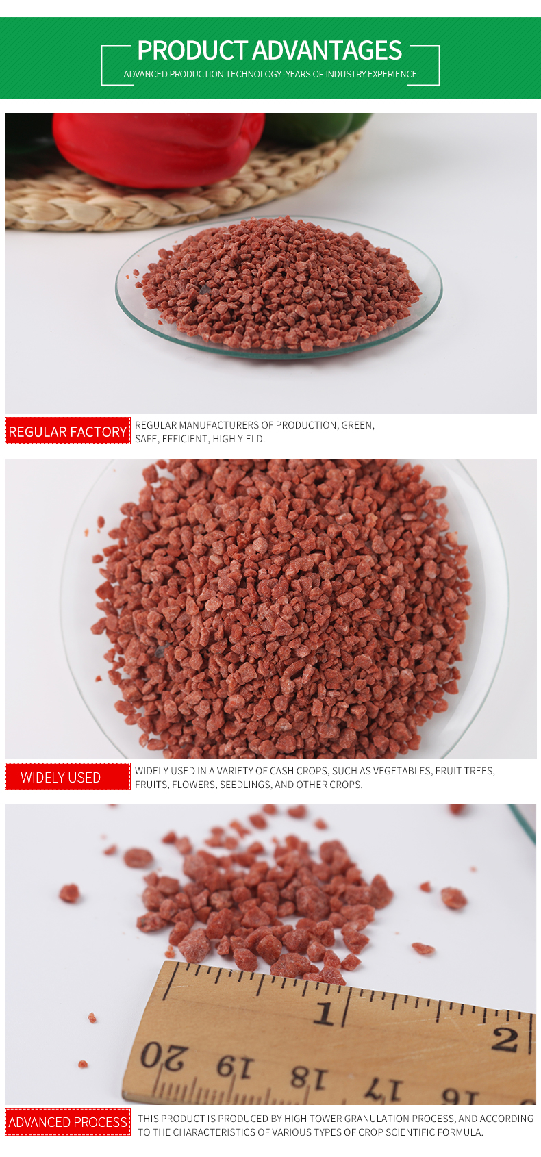 We can produce fertilizers of various formulas according to the natural conditions of the local soil, different types and growth periods of crops, and fertilization methods. We can also provide custom packaging according to customer's requirements and designs.