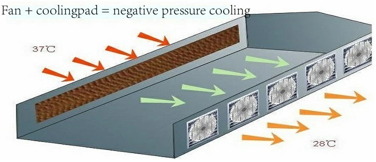 The system mainly uses the principle of water evaporation to reduce the temperature inside the greenhouse. When the temperature outside the greenhouse is too high, the exhaust fan will exhaust the air in the greenhouse to the outside, thus forming a negative pressure inside and outside the greenhouse. So when the outdoor air enters the room through the water curtain this will lower the internal temperature.