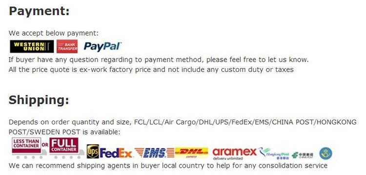| delivery conditions | 1. FOB HK/China, 2. CIF by air/ship/courier |