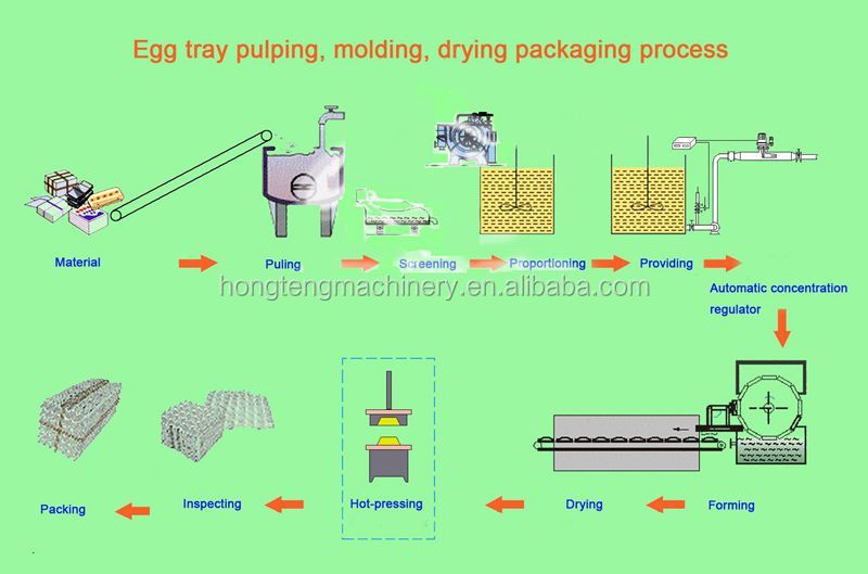 The whole production line includes pulping system + egg tray forming system + egg tray drying system + egg tray packaging system.