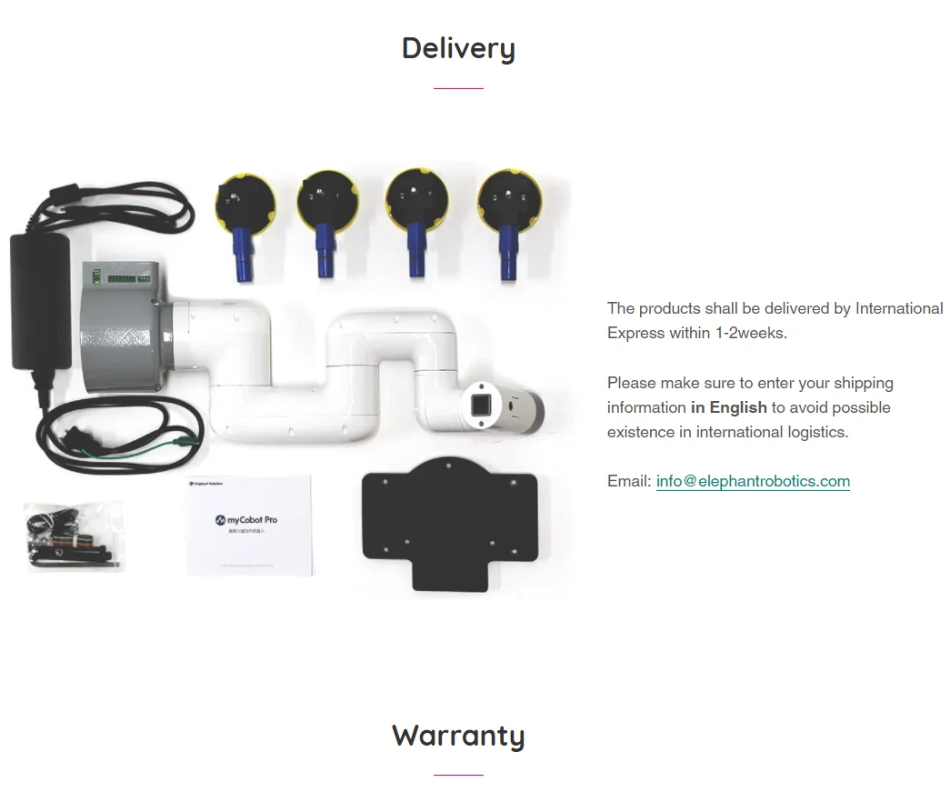 | 3-6 months | Customers need to send it back after disassembly and bear the freight out and home, Elephant Robotics shall send a new one for free. |