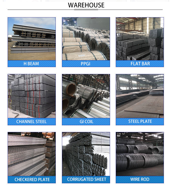 A:Almost all kinds of steel product, like the steel plate,steel coil,corrugated steel sheet, wire rod,steel channel,angle steel, h beam,flat bar ect.