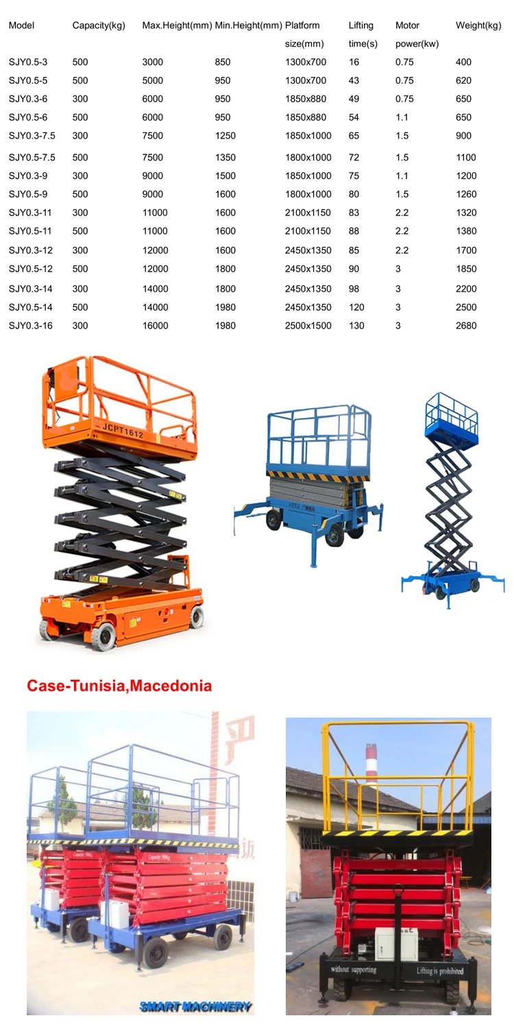| Model | Capacity(kgs) | Max height (mm) | Min height (mm) | Platform size (mm) | Motor power (kw) | Weight(kgs) |