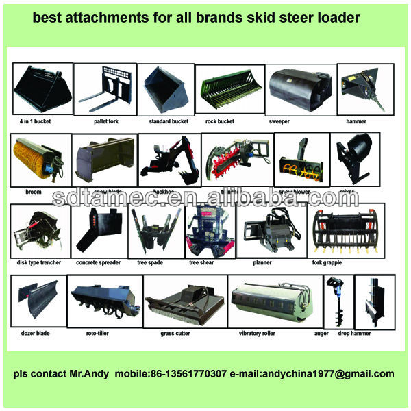 Our products are pallet fork, 4 in 1 bucket, bulldozer shovel, snow shovel, grab bucket, fork grab bucket, backhoe, sweeper, corner broom, hydraulic breaker, trencher, auger, vibratory roller,