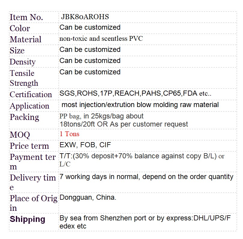 Hot selling qualityPVCGranules and composite raw materialsMaterialProducts used forvarious specificationsAutomobiles, toys, pipes, pipes, shoe soles, carpets, plugs, switch bottom boxes, medical, electronic wire and cable products and various PVC injection/extrusion products, etc.