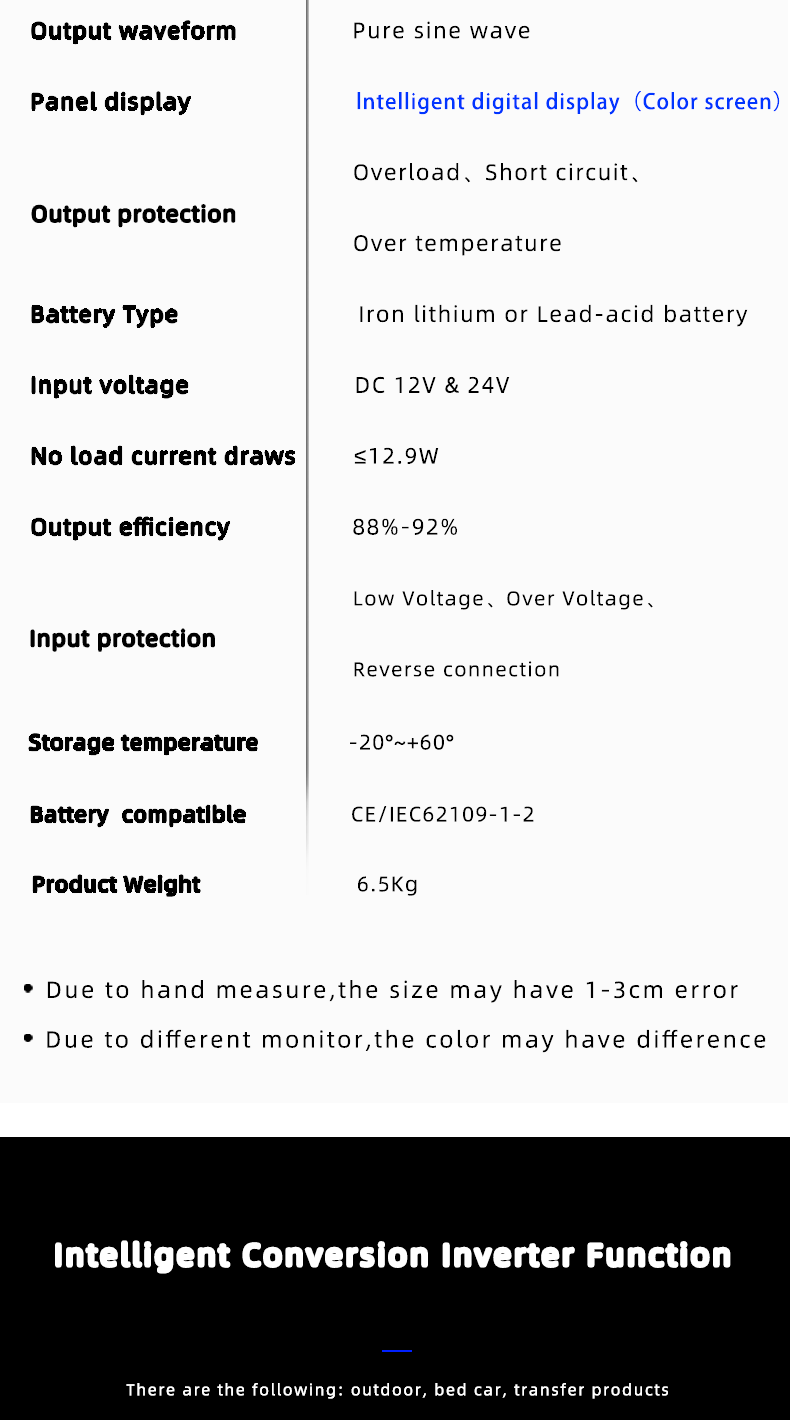 | Output protection: overload, short circuit, over temperature | Product weight: 6.5KG |