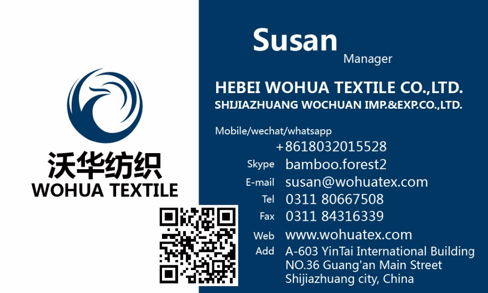 Hebei Wohua Textile Co., Ltd. is a large-scale textile production and export enterprise integrating independent research and development design, brand management, large-scale production, and domestic and foreign sales. Our company is located in the traditional textile base - Shijiazhuang City. It has 80,000 spindles, 200 75" shuttle looms, 100 75" air-jet looms, 180 rapier looms such as 340 and 200, and has advanced bleaching, dyeing and printing combined production lines. At the same time we have a first-class sales and quality control team, with an annual output of more than 30 million meters.